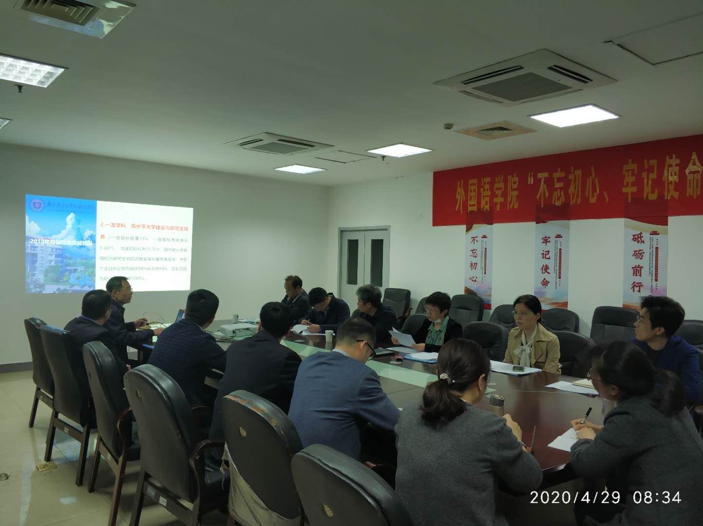学院院长王玉括首先从三个方面汇报学院总体情况。一是2019年学院重点工作及核心指标完成情况;二是对标找差,着重对比省内双一流或高水平大学的外国语言学科及英语、日语、翻译专业建设情况,相关行业高校的新葡萄88805官网师资队伍、科研成果与学科特色;三是2020年学院发展思路和重点工作计划,主要从师德师风建设、师资队伍建设、学科建设、人才培养、科学研究等方面介绍。